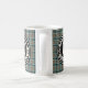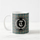 Tasse mit dem Jagdtartan für Clan Thompson, ein traditionelles schottisches kariertes Muster in hellblauen, braunen und schwarzen Farbtönen mit leuchtend grünen Akzenten. Vintages Muster aus dem Jahr 1958. Das Monogramm wird zunächst in einem Old English Schriftart und in einem runden schwarzen Abzeichen mit Lorbeeren auf beiden Seiten der Tasse vorgestellt.