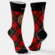 Clan Wallace Wappen Abzeichen umgeben von einem Gurt und Schnalle über Tartan Hintergrund. Benutzerdefinierte Farbe des oberen Streifens. Benutzerdefinierter Text auf jeder Socke.