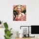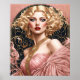 Die Eleganz der Art-Déco-Ära mit dem digitalen Porträt einer eleganten Dame, deren Stil den Glamour der 20er Jahre ausstrahlt. Sie ist mit einem opulenten goldenen Kopfteil geschmückt, das ihr voluminöses, marcel gewundenes blondes Haar perfekt betont. Ihr durchdringender Blick und die fett roten Lippen verleihen ihrem Porzellanschaum eine Touch von Drama und Selbstvertrauen, gerahmt durch einen stilisierten Hal aus komplizierten, wirbelnden Mustern, die an das ikonische Design der Zeit erinnern. In einem rot-rosa Gewand mit feinen Falten vergewaltigt, die die Weichheit der Blütenblätter der Rose nachahmen, ist sie der Inbegriff Vintager Gnade. Jedes Detail, von ihrem verzierten Schmuck bis zu den prächtigen Texturen, strahlt den Luxus und den Überschwang der Jazzzeit aus.
