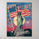 Die Freiheitsstatue wurde in der Mitte prominent angezeigt. Eine lebendige amerikanische Fahne windet im Hintergrund und ein Feuerwerk stürzt um sich herum. "Glücklicher 4. Juli!" in kühlem, Vintagem Schriftart an der Spitze, mit "Celebrate Freedom" in einem kleineren, eleganten Drehbuch unten. Traditionelles Rot, Weiß und Blau mit einem etwas verblassten, Vintagen Ambiente.