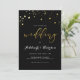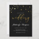 Klassische Hochzeitseinladungen mit Imitaten mit goldenen Fotolackenkonfetti und eleganter Typografie vor schwarzem Hintergrund. "Hochzeit" wird in einer schicken Kalligraphie und Serif-Schriftart-Kombination dargestellt. Diese Einladung kehrt zu einem schwarzen Hintergrund mit einem goldenen Sternmuster zurück. Sie können die Hintergrundfarbe ganz einfach an Ihren Anzug anpassen.