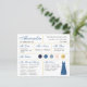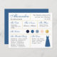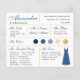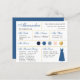 Eine klassische blau-goldene Bräunungskarte mit Informationen über das Hochzeitsdatum und den Ort der Hochzeit, die Hochzeitsfarben, das Brautparty, das Brautjungkleid und eine Bräunungsempfehlung. Der Name der Brautjungfrau und die Titel sind in einem blau-eleganten Drehbuch geschrieben. In der unteren rechten Ecke ist ein blaues Kleid. In der Mitte befinden sich die Hochzeitsfarben in Kreisen: 3 Nuancen Blau, Rosa und Gold. Die Farben, einschließlich der Farbe des Hochzeitskleides, können geändert werden, mit Ausnahme des Silberkreises, das sind Imitate Goldfolie.