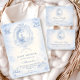 A classic powder-blue toile design inspired by traditional French countryside prints. Vintage nursery motifs — pram, rocking horse, lamb, pastoral village scenes and delicate ornamental borders — frame a clean, structured central layout. The soft ivory background paired with refined blue linework creates a timeless and sophisticated look. Perfect for a traditional baby shower with an elegant European aesthetic.