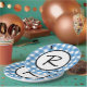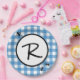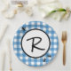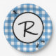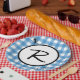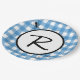 Bieten Sie Ihren Gästen des Picknick-Party im Hinterhof diese klassischen Teller mit Picknickameisen über einem blau-weißen Gingham-Karo mit Ihrem Monogramm oder Initial in einem lässigen Schriftart-Stil.