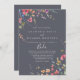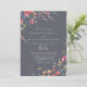 Diese klassische, blaue, florale spanische Hochzeitseinladung ist perfekt für eine tropische Hochzeit. Das Design besteht aus rosa, lila, gelben, bordeauxfarbenen, von der Marine und blau gezeichnet wilden Blume, die in schönen Formen angeordnet sind.