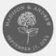 Add a sleek finishing detail to your wedding with these charcoal gray hydrangea wedding stickers, featuring a white hydrangea and lettering on a charcoal background. The circular layout highlights the couple’s names and wedding date in a clean and balanced format. Perfect for sealing envelopes, labeling favor bags and boxes, or using on welcome bags, these stickers work well for formal weddings, evening weddings, and modern venues.