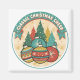Celebrate the season with timeless charm in this vintage-inspired Christmas design. Set within a circular frame, a warm cream radial burst background with golden starbursts creates a nostalgic holiday glow. Stylized evergreen trees in festive shades of green, red, and yellow are dusted with snowy white dots, while the foreground features colorful retro Christmas ornaments in teal, red, yellow, and blue, each adorned with classic patterns. A teal polka-dot banner across the top reads “CLASSIC CHRISTMAS CHEER,” and a lightly distressed texture completes the old-fashioned look. Perfect for anyone who loves retro style and traditional holiday warmth.
