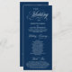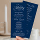 Elegantes klassisches Marineblau-Thema, Hochzeitsfeierprogramm in 4x9 Zoll (lang) Karte. Es ist mit Scrollakzent entworfen, der personalisiert werden kann mit benutzerdefiniertem/personalisiertem Text für Ihr Brautparty, Zeremonie Details, Gedenkhinweise und Dankeschön-Nachricht.