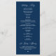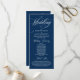 Elegante Vintage Klassik Marine Blue Drehbuch, Hochzeitsfeier Programm in Karte (lang). Es ist mit Scrollakzent entworfen, der personalisiert werden kann mit benutzerdefiniertem/personalisiertem Text für Ihr Brautparty, Zeremonie Details, Gedenkhinweise und Dankeschön-Nachricht.
