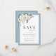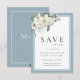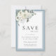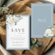 Klassische Elegant Save the Date Karte mit Aquarell Elfenbein Blume und Grün und einem staubigen blauen Rahmen.