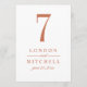 Eine elegante und stilvolle Tischnummer mit Terracotta-Orange-Hochzeitskarte besticht durch ein elegantes, minimalistisches Design in Monogramm-Typografie. Der benutzerdefinierte Text und die Tischnummer können mit den Namen der Braut und des Bräutigams und dem Hochzeitstermin vollständig personalisiert werden. Bitte beachten Sie, dass jede Tischnummer individuell angepasst und in den Warenkorb aufgenommen werden muss (1,2,3...). Bitte kaufen Sie unsere Classic Elegant Terracotta Orange Wedding Collection für die Koordination von Entwürfen.