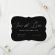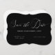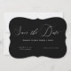 Elegante und formelle Save the Date Card mit Kalligraphie Script und Minimaltext mit schwarzem Hintergrund und weißem Text. Namen, Datum, Ort und zusätzlicher Text und alle Farben können auf dieser Classic Save the Date Einladung für Ihre kommende Hochzeit geändert werden. Eine klassische Wahl für jede elegante Hochzeit.