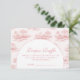 Celebrate a timeless and romantic baby shower with this elegant pink toile design, featuring delicate vintage countryside illustrations in soft blush tones. The refined arch layout creates a beautiful focal point for your event details, blending classic European charm with a modern, feminine aesthetic. Perfect for a chic, storybook-inspired celebration, this design feels both graceful and effortlessly sophisticated—ideal for creating a memorable and stylish gathering.