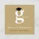This classic and simple gold and white graduation enclosure card design features a bold monogram letter 'g' of the graduate with a black mortarboard / graduation cap as an accent.