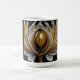 An imaginary gemstone flower composed of a large Tiger's Eye gemstone bud, tiny pearls, and elegant petals, covers this mug.