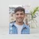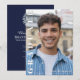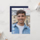Celebrate your graduate with this classic navy blue photo graduation announcement featuring a timeless and elegant layout. The front showcases a vertical photo with modern typography, while the back includes a refined design with a graduation cap wreath and formal event details.