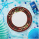 Schönes und festliches Urlaubsprojekt mit goldenen Imitaten Blätter und Heiligen mit Mitte-Weiß-Kreis auf reichhaltigem rot, schwarz und goldfarbenem Hintergrund.