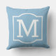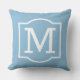 Stilvolles und klassisches quadratisches Akzent Kissen mit einem Monogramm-Initial mit einem einfachen dekorativen Rahmen in weißer Farbe mit Himmel / pulverblau Hintergrund. Passen Sie den Hintergrund an, um sich mit Ihrer Außendekoration abzustimmen.