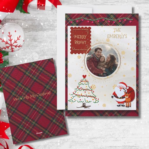 Add festive charm to your holidays with this personalized Christmas photo ornament. A hand drawn Christmas tree, a joyful Santa, reindeer, golden snowflakes, and a cozy red plaid border. The classic whimsical Christmas style blends cheerful color with traditional warmth, creating a joyful design for your holiday celebrations.
