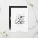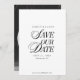 This classy elegant save the date card in black and white features a minimalist design with "save our date" styled in a mixture of classic text and elegant calligraphy script that lends a sophisticated, classy style with old money vibes. The design also features a place to add your photo that covers the entire back of the card.