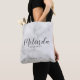 Klassische Elegant Marmor Modernes Drehbuch Personalisierte Bridesmaids Tote Bag mit personalisierten Bräunungsnamen im modernen kalligraphischen Schriftart Stil mit Titel und Hochzeitstermin in modernen sans serif Schriftart Stil auf weißem Marmor Hintergrund. Auch perfekt für die Trauzeugin, Blumenmädchen, Brautmutter und vieles mehr.
