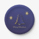 Elegantes Weihnachtsbild mit einem einfachen, sauberen, blauen Weihnachtsbaum mit goldenen Schneeflocken. Dieses Papier Kunstdesign ist modern, festlich, minimalistisch und beruflich.