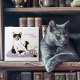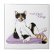 Kleine Kalico Katze sitzt auf einem Kissen mit Zunge, die sich herausklebt und das Bein hochhebt.... eine sehr schicke Katze.