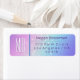Personalisieren Sie Ihren Namen, Ihre Adresse und Ihr Monogramm auf diesem eleganten Rücksendetikett in lila und weißem Text auf lila und blauem Hintergrund.