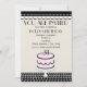 Eine Geburtstagsfeier mit einem hellrosa, schwarzen und weißen Farbschema. Beigefarbenes Papier und Champagner-Metallpapier. Illustration eines rosa und schwarzen Geburtstagskuchens am unteren Ende auf einem weißen Kuchenständer und eines weißen mit schwarzem Polka Dot Tischdecken. Oben hat eine schwarz-weiße Kante. Text ist schwarz. Personalisieren Sie mit Details Ihrer Gelegenheit, und Altern auf Kuchen.