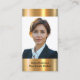 Elegantes Foto Real Anwesen Broker Visitenkarten Design in einer bearbeitbaren Vorlage erstellt mit goldfarbenen digital bedruckten Designelementen, die dieser vertikalen Visitenkarte ein hochwertiges Aussehen verleihen. Vorgestellt auf hochwertiger glänzender Oberfläche.