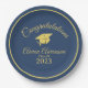 Einfache, aber stilvolle Graduierungsparty-Teller verfügen über einen goldenen Kreis um den Rand und modernen Goldtext auf marineblau-blauem Hintergrund. Ein elegantes und elegantes Aussehen für einen Absolventen der Oberschule oder Uni. In der Mitte der Platte befindet sich ein Mörtel für die Goldabstufung. Personalisieren Sie mit dem Namen des geschlossen Senior und dem Abschluss Jahr.
