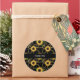 Vielen Dank an die Aufkleber mit einem eleganten und stilvollen Muster. Hübsche gelbe Sonnenblumen und grüne Blätter umgeben von zarten Goldketten. Schwarzer Hintergrund.