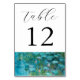 Hochzeitliche Tischnummern mit Claude Monet Water Lilies Malerei Hintergrund.