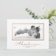 Passen Sie diese stilvolle Modern White Dankeschön Horizontal Flat Card an, die mit handgeschriebenem Skripttext entworfen wurde. Dank eines horizontalen Fotos im Kupferrahmen von Imitaten. Einfache Licht und elegante Art zu sagen danke. Bitte beachten Sie, dass es sich bei dem Kupfer um einen Farbdruck handelt und es sich nicht um metallische Farben oder Folien handelt. Die Rückseite hat den Wortlaut: "Vielen Dank, dass Sie an unserem besonderen Tag teilgenommen haben und den Beginn unseres neuen Lebens gemeinsam feiern. Wir freuen uns über Ihre guten Wünsche und Ihr nachdenkliches Geschenk." Dieser Text ist vollständig anpassbar. Ersetzen Sie alle Informationen und das Vorlagenbild durch Ihr eigenes. Wenn Sie weitere Änderungen benötigen, klicken Sie auf die Schaltfläche Anpassen! oder wenden Sie sich an den Designer. Für beste Ergebnisse verwenden Sie ein hochauflösendes Bild, es kann farblich sein, aber dieses Design sieht besonders elegant aus, wenn das Foto schwarz-weiß ist. *Template Foto Credits © by Timothy Marsee