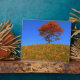 Eine friedliche 3D-Landschaft im Herbst, geschaffen in Vue. Auf einem Hügel, der von einem großen, goldenen Gras bedeckt ist, steht ein einziger orangefarbener Ahorn mit einer Holzbank, um zu stoppen und Erholung zu machen.