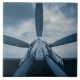 Nahaufnahme der Propeller des kleinen Kolbenflugzeugs vor dem Hintergrund eines dunklen Wolkenkratzes. Klare Requisite! Los geht's! Aviate, navigieren, kommunizieren!