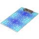 A clipboard featuring a blue and teal bokeh pattern, with round white dots giving it a soft, calming effect. The metallic clip is shiny and reflective.