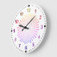 Galaxy of rainbow colored stars that spirals around a clear center point. Small stars in center to larger stars at outer edge. Rainbow colored numerals with black drop shadow. Minute marks at edge, 12, 3, 6, and 9 have large black dots .