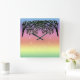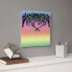 Tree, in black with tint of green, reaching from upper corners over the white numerals of the clock face. Background is striped rainbow colors shading through blue purple, pink, red, orange, yellow, and green, from top to bottom.