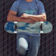 Ein Skateboard mit bewölktem Himmelsdesign. Entworfen von © KatyKreations.