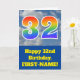 Die Vorderseite dieses lustigen 32. Geburtstagskarten-Designs zeigt eine Darstellung eines bewölkten blauen Himmels, zusammen mit der Zahl "32" mit einem bunten Regenbogenspektrum wie Gradientenlook. Auf der Vorderseite befindet sich auch eine Geburtstagsgrüßbotschaft mit einem personalisierten Empfängernamen. Im Inneren befindet sich eine personalisierte Geburtstagsgrüßbotschaft, oder man könnte sie löschen und leer verlassen werden, wenn eine Nachricht von Hand geschrieben werden soll. Eine solche individuelle Geburtstagskarte könnte eine lustige Art sein, Geburtstagswünsche an jemanden zu senden, der seinen 30. Geburtstag feiert. [~Z0000370]
