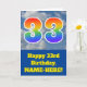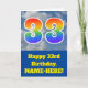 Die Vorderseite dieses lustigen 33. Geburtstagskarten-Designs zeigt eine Darstellung eines bewölkten blauen Himmels, zusammen mit der Zahl "33" mit einem bunten Regenbogenspektrum wie Gradientenlook. Auf der Vorderseite befindet sich auch eine Geburtstagsgrüßbotschaft mit einem personalisierten Empfängernamen. Im Inneren befindet sich eine individuell angepasste Geburtstagsgrüßbotschaft, oder man könnte sie löschen und leer verlassen werden, wenn eine Nachricht von Hand geschrieben werden soll. Eine individuell anpassbare Geburtstagskarte wie diese könnte eine lustige Art sein, Geburtstagswünsche an jemanden zu senden, der seinen dreißigsten Geburtstag feiert. [~Z0000370]