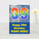 Die Vorderseite dieses lustigen 39. Geburtstagskarten-Designs zeigt eine Darstellung eines bewölkten blauen Himmels, zusammen mit der Zahl "39" mit einem bunten Regenbogenspektrum wie Gradientenlook. Auf der Vorderseite befindet sich auch eine Geburtstagsgrüßbotschaft mit einem personalisierten Empfängernamen. Im Inneren befindet sich eine benutzerdefinierte Geburtstagsgrüßbotschaft, oder man könnte sie löschen und leer verlassen werden, wenn eine Nachricht von Hand geschrieben werden soll. Eine individuell gestaltbare Geburtstagskarte wie diese könnte eine lustige Art sein, Geburtstagswünsche an jemanden zu senden, der seinen neununddreißigsten Geburtstag feiert. [~Z0000370]