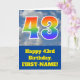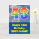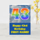 Die Vorderseite dieses lustigen 43. Geburtstagskarten-Designs zeigt eine Darstellung eines blauen Himmels mit Wolken, zusammen mit der Zahl "43" mit einem bunten Regenbogenspektrum wie Gradientenlook. Auf der Vorderseite befindet sich auch eine Geburtstags-Grußbotschaft mit einem bearbeitbaren Empfängernamen. Im Inneren befindet sich eine personalisierte Geburtstagsgrüßbotschaft, oder man könnte sie löschen und leer verlassen werden, wenn eine Nachricht von Hand geschrieben werden soll. Eine solche individuelle Geburtstagskarte könnte eine lustige Art sein, Geburtstagswünsche an jemanden zu senden, der seinen dreiundvierzigsten Geburtstag feiert. [~Z0000370]