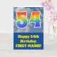 Die Vorderseite dieses lustigen 54. Geburtstagskarten-Designs zeigt eine Darstellung eines blauen Himmels mit Wolken, zusammen mit der Zahl "54" mit einem bunten Regenbogenspektrum wie Gradientenlook. Auf der Vorderseite befindet sich auch eine Geburtstagsgrüßnachricht, einschließlich eines benutzerdefinierten Empfängernamens. Im Inneren befindet sich eine benutzerdefinierte Geburtstagsgrüßbotschaft, oder man könnte sie löschen und leer verlassen werden, wenn eine Nachricht von Hand geschrieben werden soll. Eine individuell anpassbare Geburtstagskarte wie diese könnte eine lustige Art sein, Geburtstagswünsche an jemanden zu senden, der seinen vierundfünfzig Geburtstag feiert. [~Z0000370]