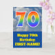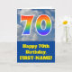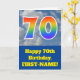 Die Vorderseite dieses lustigen 70. Geburtstagskarten-Designs zeigt eine Darstellung eines blauen Himmels mit Wolken, zusammen mit der Zahl "70" mit einem bunten Regenbogenspektrum wie Gradientenlook. Auf der Vorderseite befindet sich auch eine Geburtstagsgrüßbotschaft mit einem personalisierten Empfängernamen. Im Inneren befindet sich eine bearbeitbare Geburtstags-Grußnachricht, oder man könnte sie löschen und leer verlassen werden, wenn eine Nachricht von Hand geschrieben werden soll. Eine personalisierte Geburtstagskarte wie diese könnte eine lustige Art sein, jemandes siebzigsten Geburtstag anzuerkennen. [~Z0000370]
