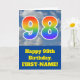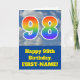 Die Vorderseite dieses lustigen 98. Geburtstagskarten-Designs zeigt eine Darstellung eines blauen Himmels mit Wolken, zusammen mit der Zahl "98" mit einem bunten Regenbogenspektrum wie Gradientenmuster. Auf der Vorderseite befindet sich auch eine Geburtstagsgrüßnachricht, einschließlich eines benutzerdefinierten Empfängernamens. Im Inneren befindet sich eine individuell anpassbare Geburtstags-Grußnachricht, oder vielleicht kann gelöscht und links werden, wenn eine Nachricht von Hand geschrieben werden soll. Eine personalisierte Geburtstagskarte wie diese könnte eine lustige Art sein, eine Botschaft zum Feiern des achtundneunzigsten Geburtstages von jemandem zu senden. [~Z0000370]