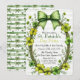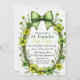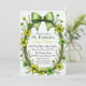 A festive St. Patrick’s Day–themed invitation featuring a clover wreath and decorative bow over soft stripes. This design is fully customizable, and the coordinating patterned artwork is printed on the back.