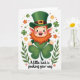This card features a cheerful leprechaun-like character on a bright white background, smiling wide with rosy cheeks and a curly orange beard that frames his round face. He wears a green top hat with a shiny gold buckle, and his green outfit looks smooth under soft, even lighting. His hands cradle an oversized four-leaf clover 💚, held close like a small gift meant for someone special. Around him, smaller clovers ☘️ and tiny flowers in orange, pink, and pale yellow float like confetti, adding a gentle springtime feel. Low on the design, leafy green branches curve in from the sides and help frame the character without crowding him. The phrase “A little luck is peeking your way” sits beneath the illustration in green lettering, centered and easy to spot against the white space. The clover in his hands is shaded in deeper and lighter greens, and the gold buckle catches the light with a small gleam.