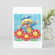 Ein lustiger glücklicher Clown unter gelben Blumen mit Gesichtern. Dieses Design sieht wirklich effektiv auf diese Einladungen
